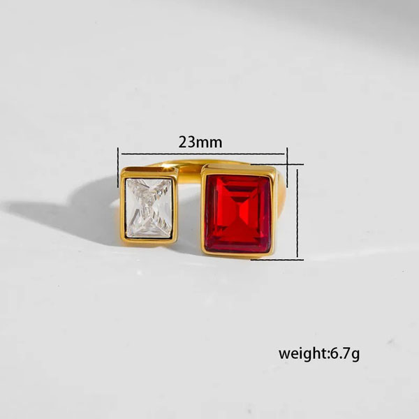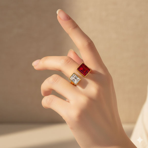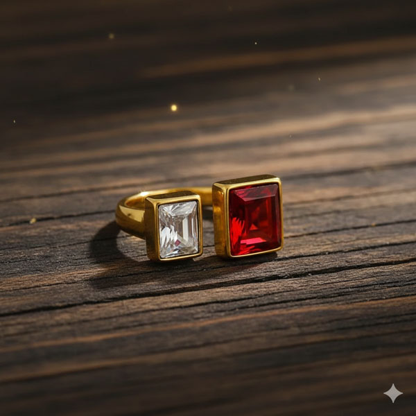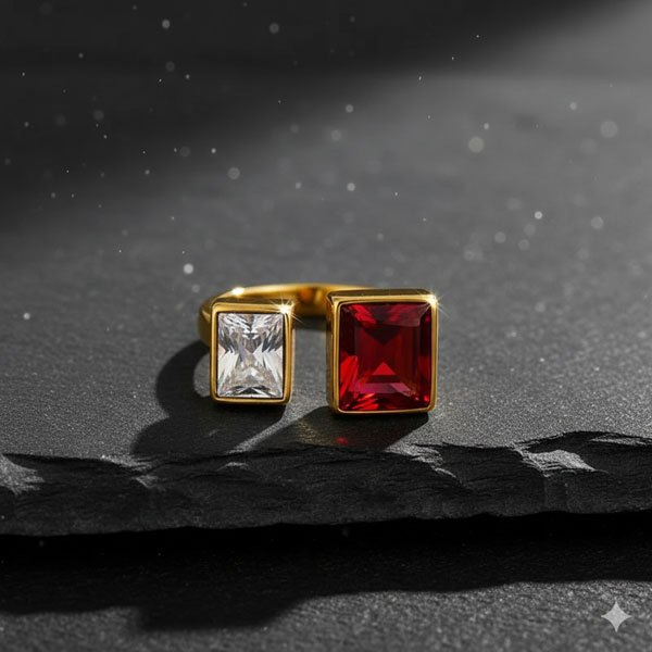 Elevate your elegance with the Dual Radiance Royale Ring by Daas For Life. This striking open-band design features two precision-cut rectangular crystals—one a vibrant ruby red and the other a brilliant clear stone—set in a polished gold-finished frame that exudes sophistication.