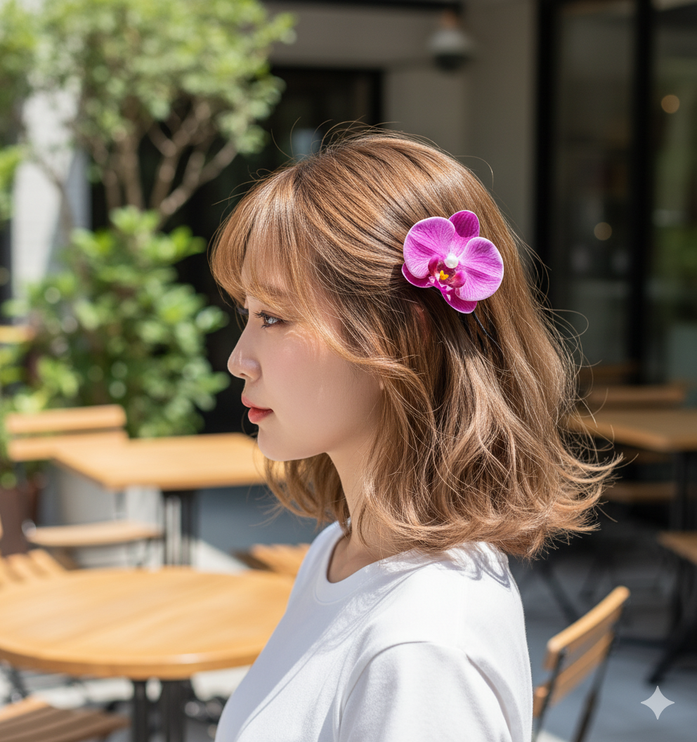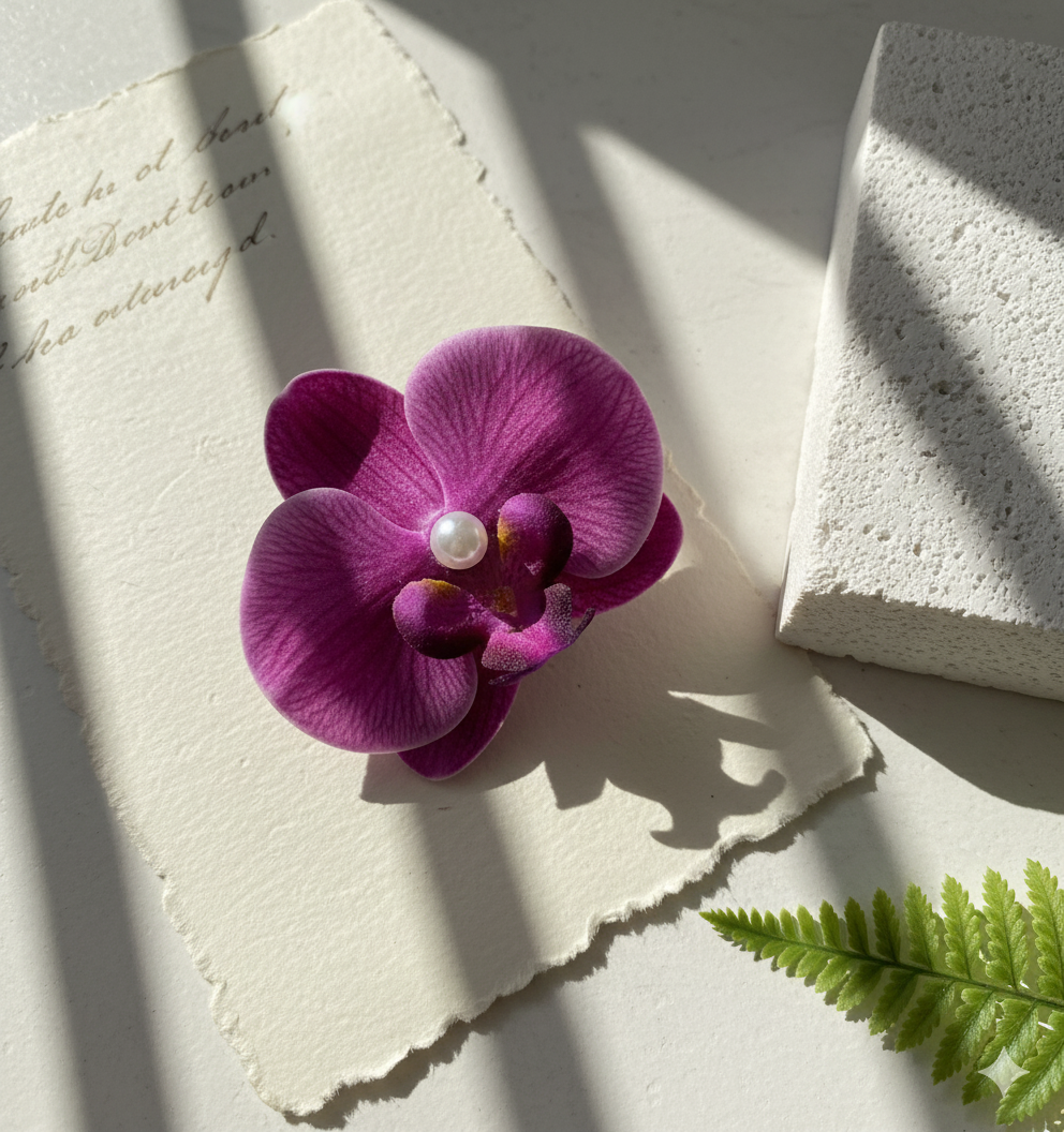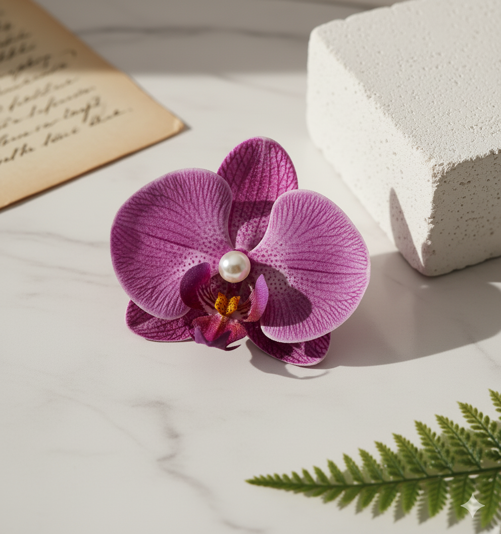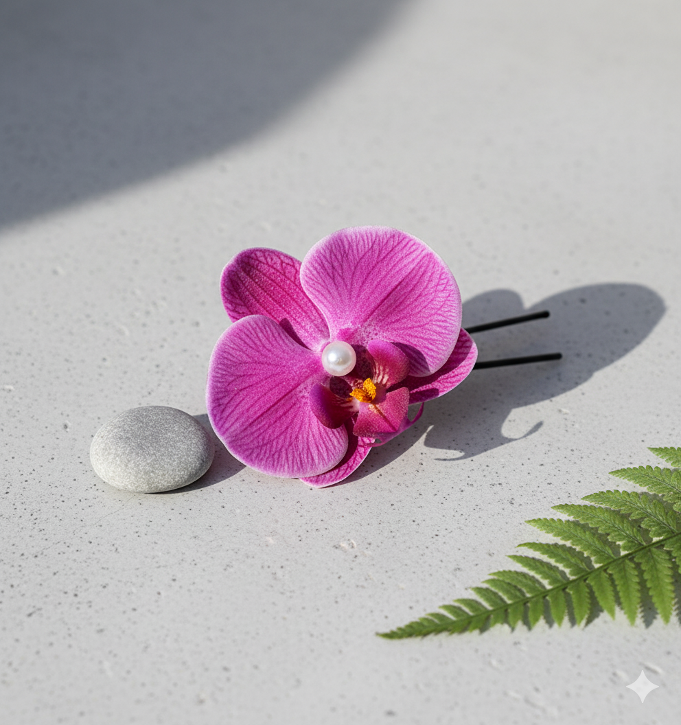 This stunning hair pin from Daas For Life features a fuchsia orchid blossom with ultra-realistic veining and depth, crowned by a luminous pearl at the flower’s heart. The vivid yet elegant bloom sits atop a classic black pin that secures your style with botanical grace. The Fuchsia Orchid Pearl Hair Pin captures the beauty of tropical gardens and brings a fresh, romantic statement to any updo—perfect for special occasions or adding floral flair to everyday looks.