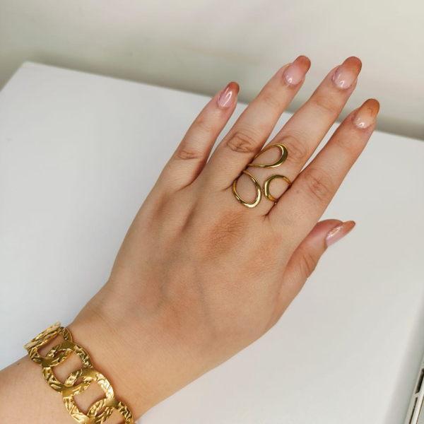 This stylish statement ring from Daas For Life features a fluid, wavy design crafted in polished gold-tone metal. Measuring 31 mm in height and 19 mm in width with a lightweight 2.2g, its sweeping curves create an elegant, contemporary silhouette that wraps around the finger with artistic flair. The ring embodies modern sophistication and effortless style, making it a standout accessory that complements both casual and formal looks. This piece reflects Daas For Life’s commitment to combining refined craftsmanship with innovative design for today’s fashion-forward wearer.