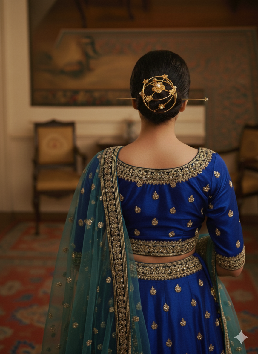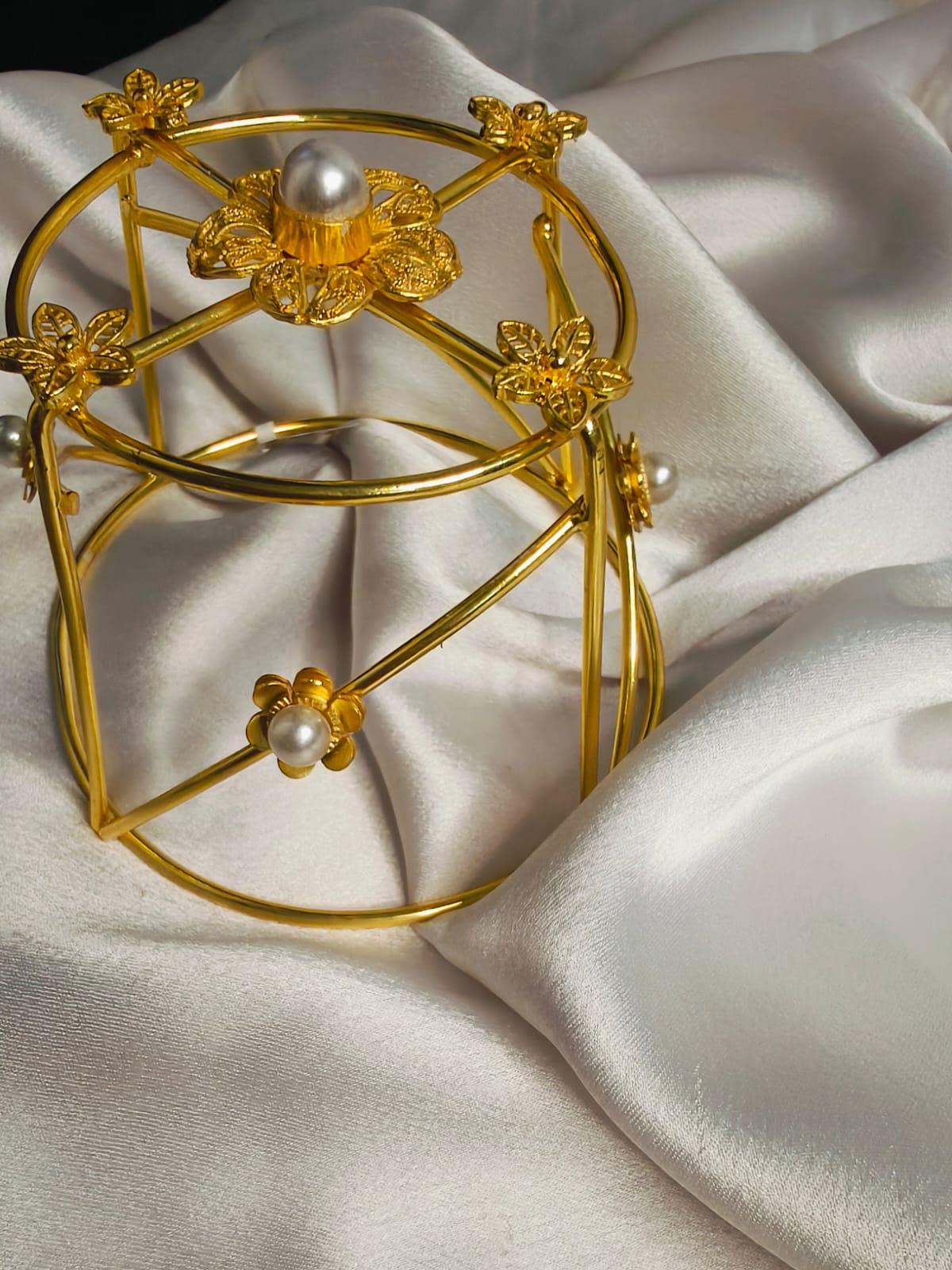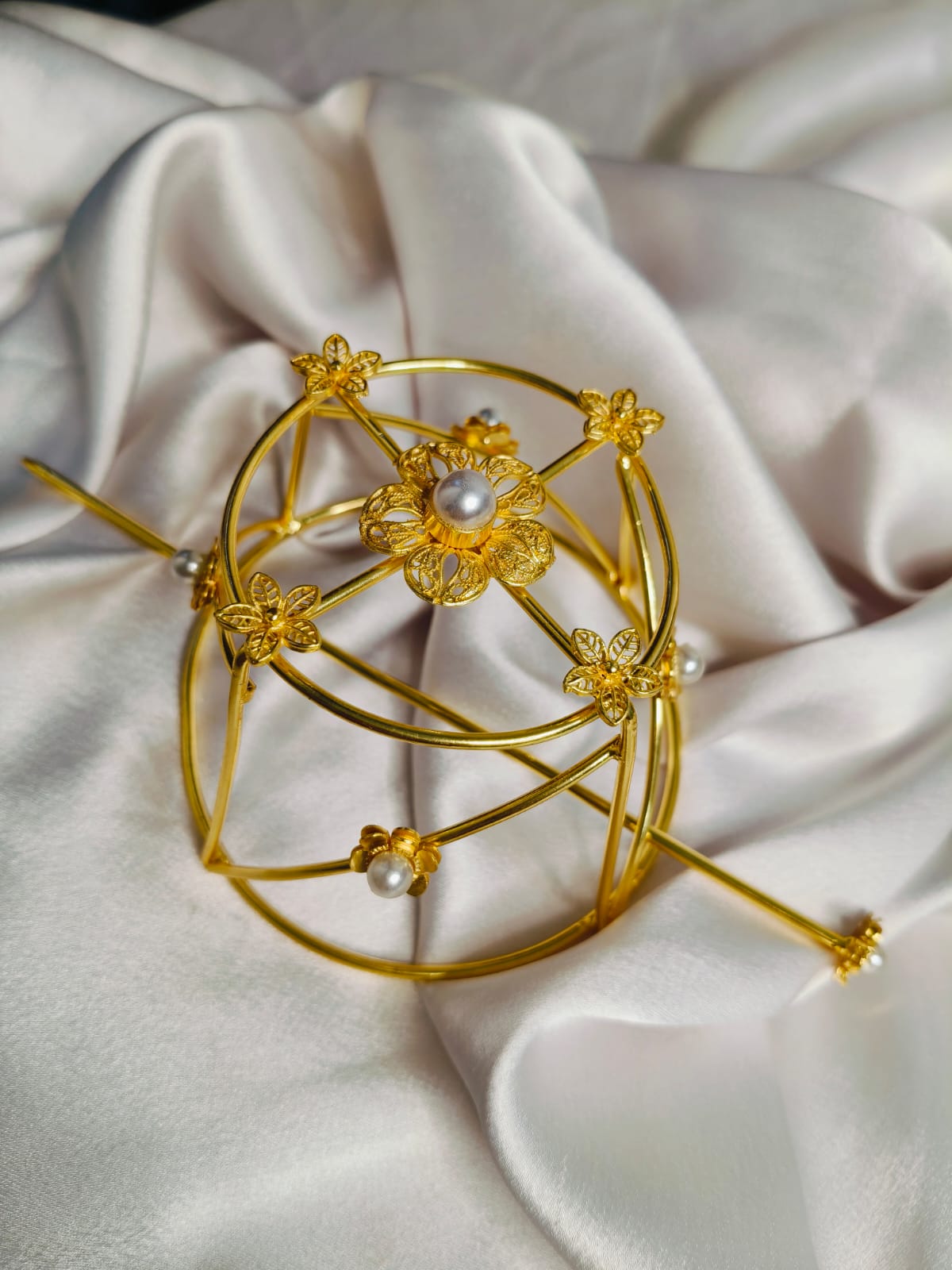 This regal bun crown from Daas For Life is crafted in shining gold-tone metal, featuring a delicate geometric halo cage adorned with sculpted golden florals and luminous pearls at every join. The intricate design embraces the bun in a circle of glowing petals, while the matching gold hair stick ensures a firm and graceful hold. Perfect for bridal, festive, or grand occasions, the Golden Petal Halo Bun Crown transforms traditional hairstyles into a vision of modern royalty and celebration.