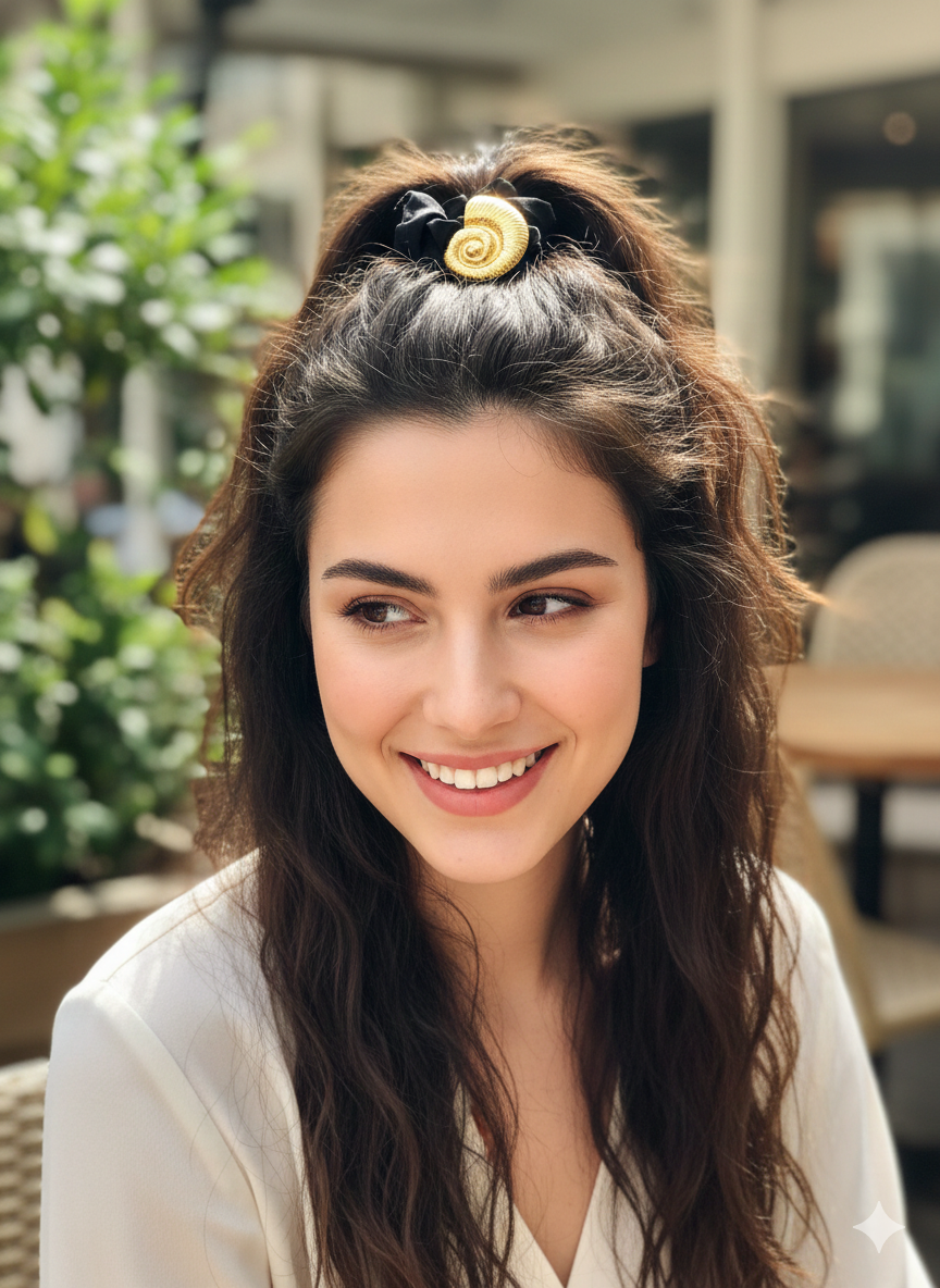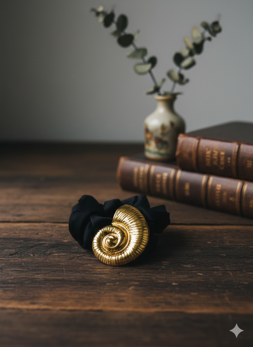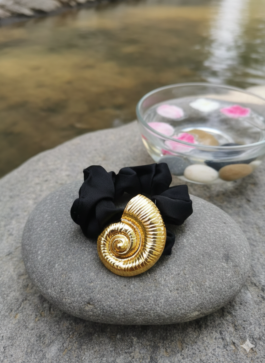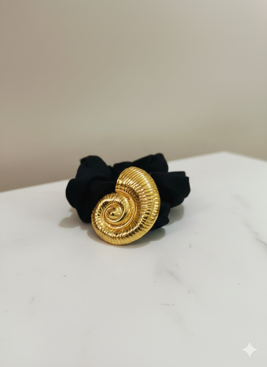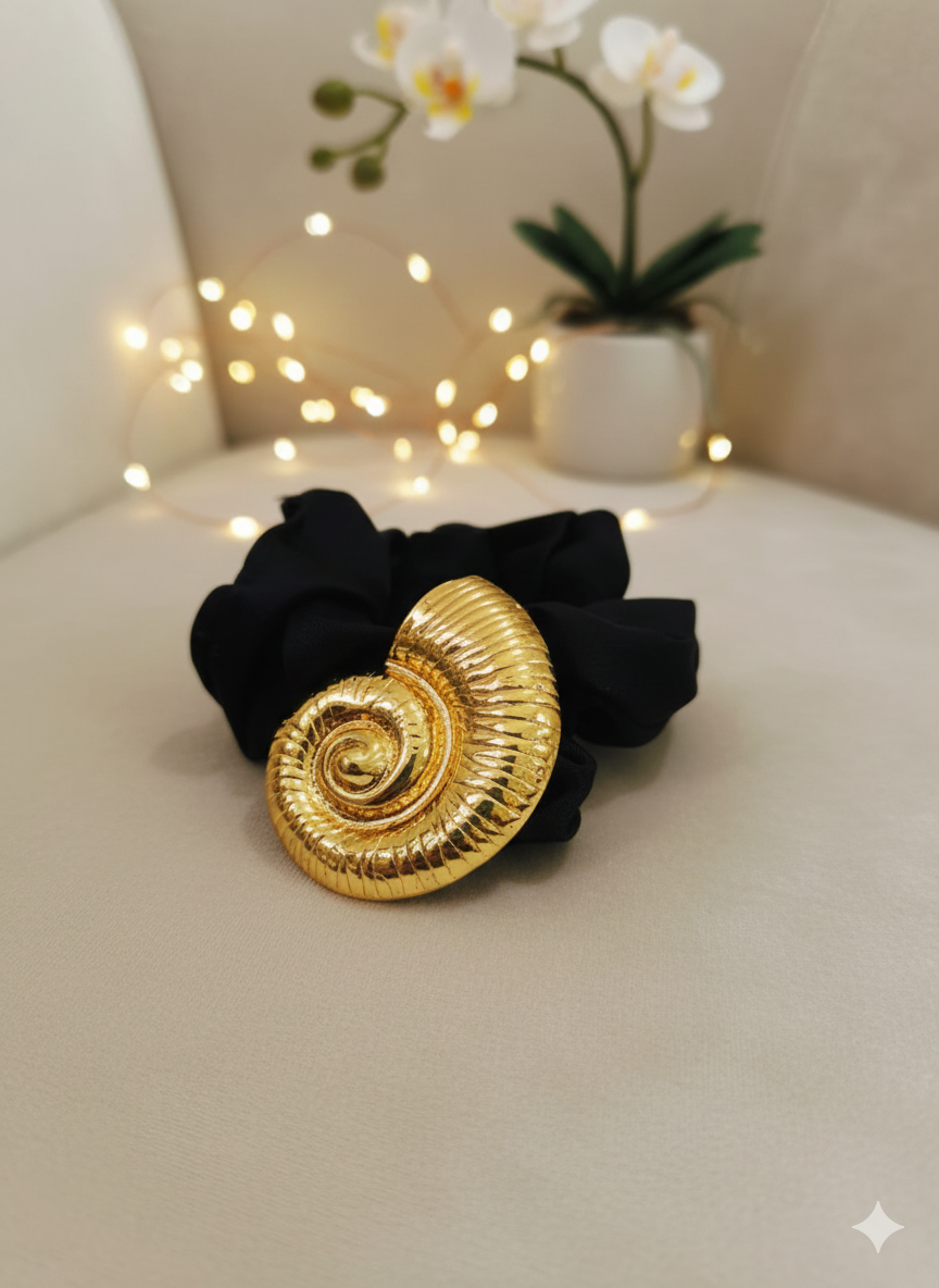 Elevate your everyday style with the Golden Spiral Luxe Scrunchie, a perfect blend of elegance and functionality. Designed with a soft black fabric scrunchie for gentle, secure hold, it features a stunning gold-toned spiral shell embellishment that adds a luxurious statement to any hairstyle. Whether for casual outings or special occasions, this chic accessory instantly upgrades your look with refined sophistication and timeless charm. Suitable for ponytails, buns, or wrist styling.