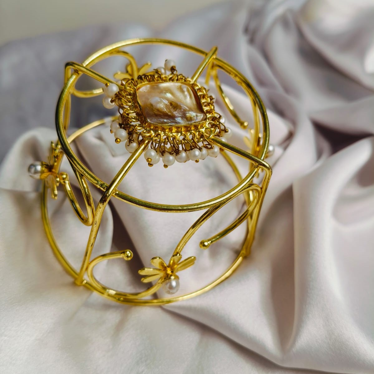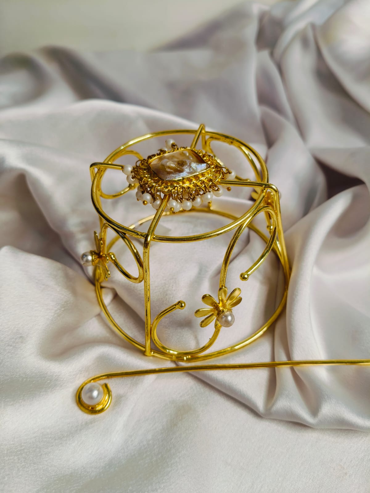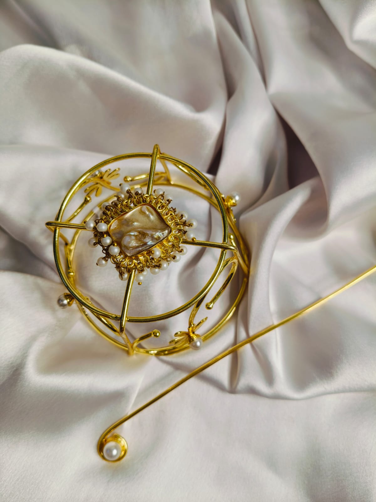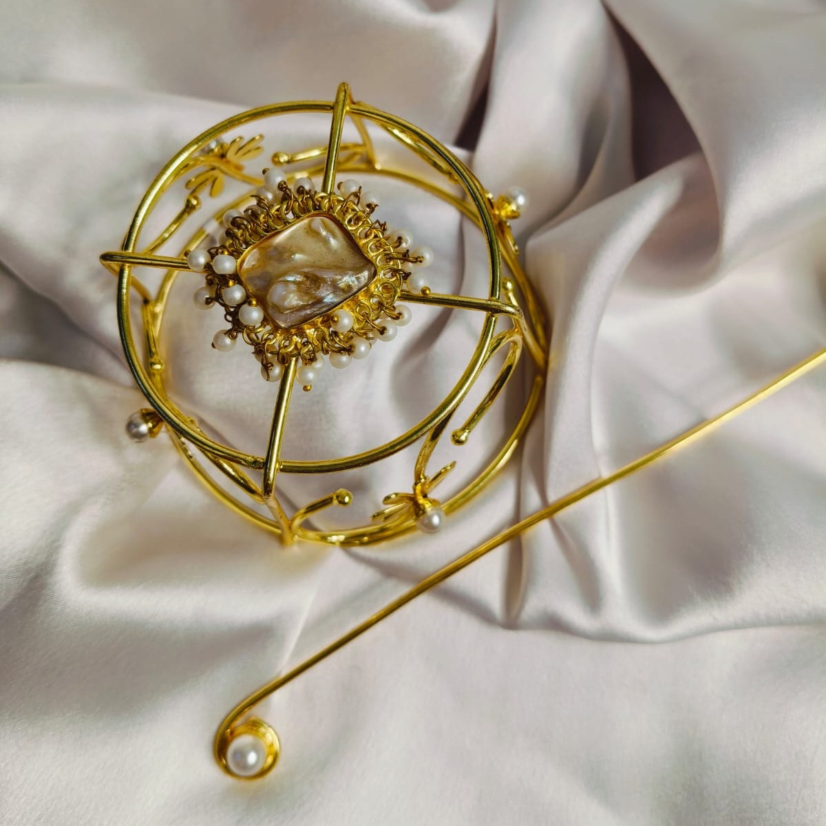 This opulent hair crown from Daas For Life features a bold, golden openwork structure adorned with a striking central baroque pearl framed by intricate filigree and delicate pearl fringe. Golden arcs wrap gracefully around the head, each adorned with dainty flower motifs and luminous pearl accents, evoking a lush, garden-inspired aura. The Regal Baroque Pearl Crown is a celebration of heritage glamour and modern artistry—an heirloom-worthy statement piece perfect for brides, special events, or anyone seeking an unforgettable royal adornment.
