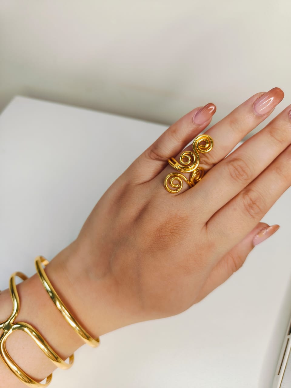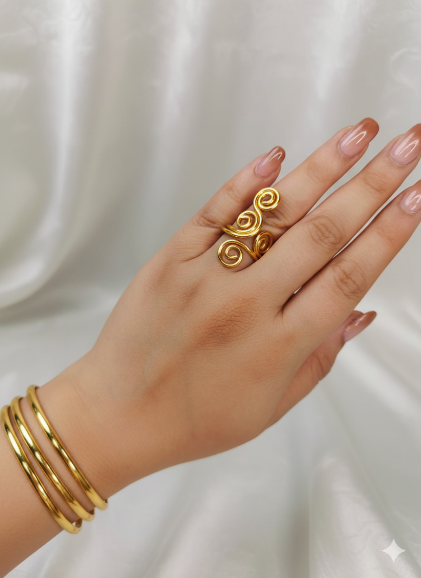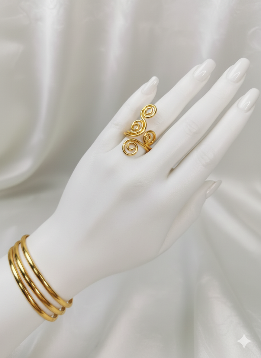 This bold and modern ring from Daas For Life features an eye-catching triple spiral motif crafted in lustrous gold-tone metal. The design showcases three interconnected spirals rising vertically above a sleek, double-band shank, creating a fluid, sculptural silhouette that draws inspiration from ancient talismans and contemporary art.