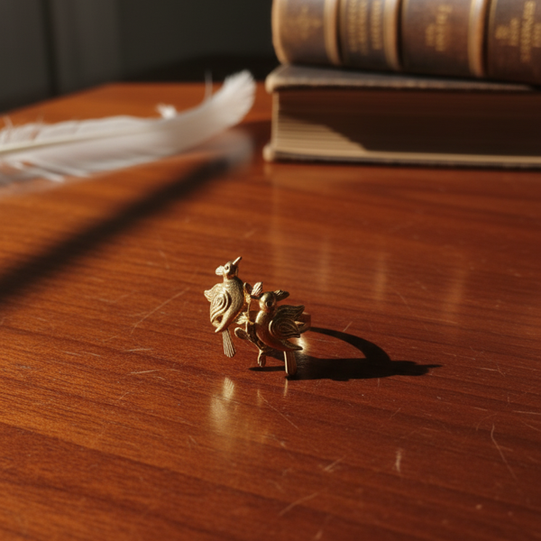 This delicate and captivating ring from Daas For Life features two intricately crafted gold-tone bird motifs perched side by side, embodying a symbol of harmony and togetherness. Each bird is masterfully detailed with finely etched feathers and graceful forms, showcasing the brand’s dedication to artisanal craftsmanship. The design captures a tender, poetic essence that celebrates nature’s beauty and companionship.
